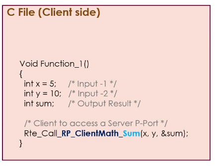 - 아래 형식을 따라 Rte_Call로 시작해서 사용할 포트와 함수를 지정 후 C 파일을 생성한다.