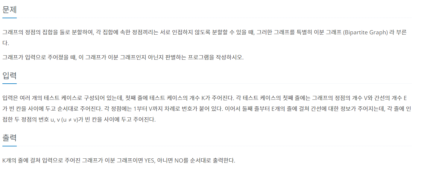 이전 방문한 곳과 같은 집합에 속하면 이분그래프가 아니므로 bipartite는 False