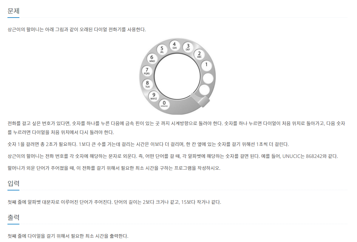 문제 첫 번째 해결방법 A를 0 Z를 25로 보고 각 다이얼(2부터 9까지)에 들어가는 알파벳의 최댓값을 넣어준다. 그 후 7이거나 9일 때는 알파벳이 네 개 들어있으므로, 알파벳의 값이 3 더 작을 때 다이얼의 값보다 1더 큰수를 answer에 더해주고, 나머지의 경우에는 2 더 작을 때 더해주어 출력한다. data = list(input()) num = 2 alpha = [] answer = 0 for i in range(0, 16, 2): result = num + i num += 1 if num < 8: alpha.append((result, num - 1)) elif num < 10: alpha.append((result + 1, num - 1)) else: alpha.append((result..